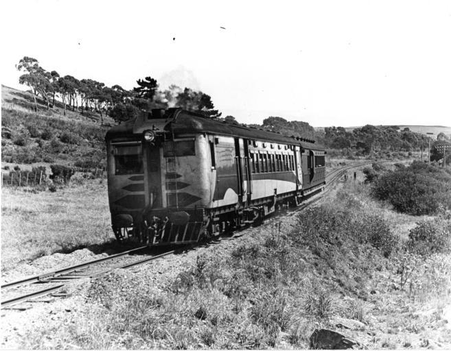 | Keywords: steam railcar railmotor train railway tasmania narrow gauge blackandwhite monochrome outdoor black and white Tasmanian Government Railways Sentinel-Cammell steam railcar of the SP5 to 9 series, east bound climbing Don Bank from Lillico, circa 1938-9. The trailer is an ABD class composite/guards/luggage carriage from circa 1909. TGR photo, Ted Lidster collection Tasmanian Government Railways Sentinel-Cammell steam railcar of the SP5 to 9 series, east bound climbing Don Bank from Lillico, circa 1938-9. The trailer is an ABD class composite/guards/luggage carriage from circa 1909. TGR photo, Ted Lidster collection |