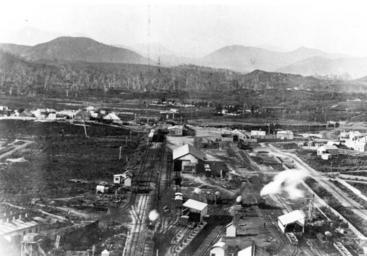 | Keywords: train railway tasmania zeehan station blackandwhite monochrome outdoor black and white An early overview of Zeehan station looking south showing the 3ft 6in Government and Emu Bay lines in the centre with an EBR train arriving and the 2ft gauge North East Dundas yards to the right. TGR photo 4S26. Ted Lidster collection An early overview of Zeehan station looking south showing the 3ft 6in Government and Emu Bay lines in the centre with an EBR train arriving and the 2ft gauge North East Dundas yards to the right. TGR photo 4S26. Ted Lidster collection |