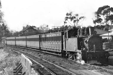 | Keywords: train railway locomotive steam narrow gauge tasmania blackandwhite monochrome outdoor vehicle railroad black and white A DS class (an ex NZR Wf class) on the down Cadbury's workers train made up of 60ft BBA class suburban carriages approaching Moonah station, 20th Oct 1947. TGR photo 4T15. Ted Lidster Collection A DS class (an ex NZR Wf class) on the down Cadbury's workers train made up of 60ft BBA class suburban carriages approaching Moonah station, 20th Oct 1947. TGR photo 4T15. Ted Lidster Collection |
