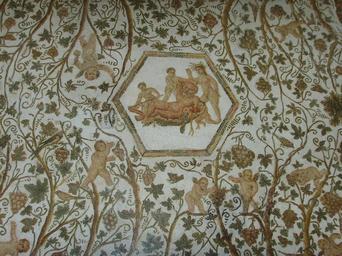 | Keywords: El Jem Museum (7).JPG en An ancient Roman mosaic in El Jem Museum in Tunisia Third century Mosaic representing multiple scenes fr Mosaïque du musée archéologique d'El Jem Tunisie datant du III e siècle et provenant de la maison de Silène Y figure des scènes multiples Le ligotage de Silène un vieillard en permanence ivre que l'on voit au milieu de la mosaïque étendu sur un lit de feuillage Autour de lui trois enfants essaient de lui attacher mains et pieds grâce à une guirlande de fleurs tressées De plus Églé autoritaire lève la main droite en direction de Silène Aux quatre angles de la mosaïque sont représentés des cratères d'où s'échappent des ceps de vigne chargés de raisins et un feuillage confus à l'intérieur desquels on voit des Amours vendangeurs un lion une lionne un chameau Hercule calmant un éléphant furieux un escargot une sauterelle un rat et de multiples oiseaux Own Effi Schweizer 2009-03-18 Silenus mosaic in the El Jem museum Silenus mosaic in El Jem museum |