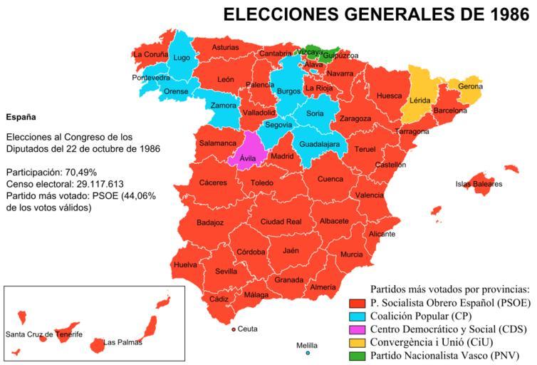 | Keywords: Elecciones generales españolas de 1986 - distribución del voto.svg Mapa de las elecciones generales españolas de 1986 elecciones al congreso de Diputados voto mayoritario por provincias Ministerio del Interior de España - http //www elecciones mir es/MIR/jsp/resultados/index htm Base histórica de resultados electorales 2006 Creado por Rodriguillo tomando como mapa base Image Provinces of Spain svg GFDL Image Elecciones generales españolas de 1986 - distribución del voto png Rodriguillo Election maps of Spain Spanish general election 1986 |