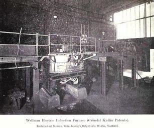| Keywords: Electric induction furnace Sheffield.jpg en Wellman electric induction furnace Gröndal Kjellin patents Brightside works Sheffield fr Four à induction de Wellman brevets de Gröndal Kjellin Brightside works Sheffield http //www archive org/details/principlespracti00macfrich California Digital Library 1917 Borvan53 PD-old Images from The principles and practice of iron and steel manufacture by W Macfarlane Induction heating Steel industry in Sheffield Military industries and wartime industrial production in World War I era |