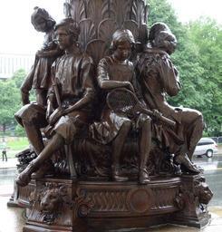 | Keywords: Electroliers, New York State Education Department Building - DSC08329.JPG Two electroliers or street lamps flank the entrance to a building They have the same design except the one depicts children studying; the other children relaxing after play Both electroliers are topped by a 20 inch-high hexagonal lamp encircled by smaller dome-shaped lights Below each light is an owl holding a garland of flowers in its beak The children appear at the base of the shaft with lion's heads below them On the right lamp nine children are seen studying dressed in school clothes They are seen reading writing counting examining a globe and holding a violin On the left lamp the children holding various toys including a doll a football a hoop a small boat a teddy bear a baseball bat and glove a tennis racket and ball and roller skates Both lamps have a brown patina This artwork is in the public domain because first published in the United States before 1923 2013-06-13 12 30 53 own Daderot cc-zero Electroliers New York State Education Department Building Uploaded with UploadWizard |
