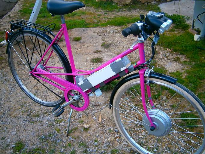 Keywords: Elektro-fahrrad-Umbau.jpg en Motobecane frame ca 1988 Nexus-8-Hub-Speeds Litium-Ion-akkumulator placed inbetween the lady-type frame 250 Watt-24 Volt chinese e-bike front wheel motorset Li-akku used from old laptop akkumulators de Motobacane Rahmen ca 1988 Baujahr Nexus-8-Gang-Nabenschaltung Lithiumionenakku im Damenrahmen platziert 250 Watt-24 Volt China-E-Bike-Motorumbausetset für Frontmotor Nutzung alter Laptop-Lithium-Akkus own Andreas Lemmer Portugal 2012-12-12 Electrically-powered bicycles Cc-zero |