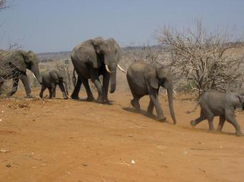 Keywords: elephants family group animals running walking botswana africa safari