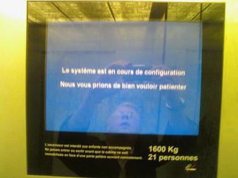 | Keywords: Elevator warning.jpg en Warning message inside an elevator cabin of a tower of Coeur-Défense Paris <br> The text is System reconfigurating Please wait fr Message dans une cabine d'ascenseur d'une tour de Coeur-Défense own Tangopaso 2009-05-19 48 53 27 59 N 2 14 38 13 E region FR Elevators in France Liquid crystal displays in public transport La Défense Humor signs Humor in France Reflections in France Reflected photographers | ||||