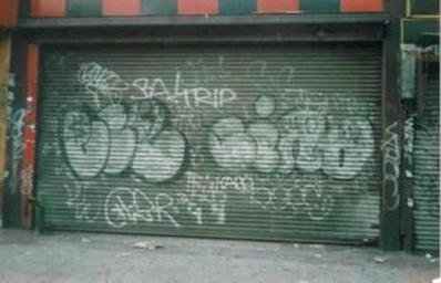 Keywords: Eli & Ciro.jpg en Graffiti at a garage door in New York Own Pureanal 9/15/89 Graffiti in New York City
