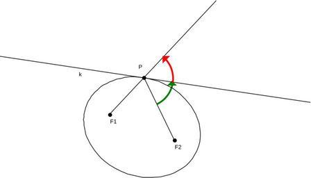 Keywords: Elipse tangent.svg k is a tangent of elipse and P is the tangency point The tangent is bisector of exterior angle in triangle F1F2P green and red angles are equal Own 2007-05-20 MatFizka Tangent vectors Ellipses