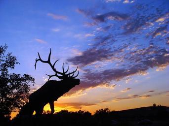 Keywords: elk silhouette colorful sky landscape sunset orange blue yellow nature wildlife tree dusk outdoor scenic