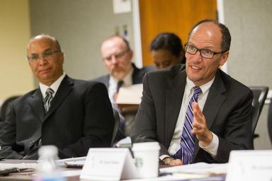 | Keywords: Elkton Richardson and Thomas Perez, 2014.jpg 29 May 2014 -Washington DC - Secretary of Labor Thomas Perez dropped by the Native American Employment Training Council meeting to give brief remarks ETA Assistant Secretary Portia Wu gave remarks earlier in the program Council members on hand for the meeting were Region 1 Mr Darrell Waldron Executive Director Rhode Island Indian Council Inc Providence Rhode Island And Chairperson of Indian and Native American Advisory Council; Region 3 Mr Elkton Richardson PICTURED WIA Program Director North Carolina Commission on Indian Affairs Raleigh North Carolina And Vice Chairperson of Indian and Native American Advisory Council; Region 3 Mr James Hardin Executive Director Lumbee Regional Development Association Inc Pembroke North Carolina; Region 4 Dr Rodney Stapp MD Executive Director Urban Inter-Tribal Center of Texas Dallas Texas; Region 5 Ms Jessica James MA WIA Director Indian Center Inc Lincoln Nebraska; Region 5 Ms Christine Molle Executive Director American Indian Council North Kansas City Missouri; Region 6 Ms Lorenda T Sanchez Executive Director California Indian Manpower Consortium Inc Sacramento California; Region 6 Ms Kristen English Chief Operating Officer Cook Inlet Tribal Council Anchorage Alaska; Ms Winona Whitman Director Department of Employment and Training Alu Like Honolulu Hawaii; Mr Jacob Bernal Executive Director American Indian Association of Tucson Tucson Arizona; Dr David Yarlott President Little Big Horn College Crow Agency Montana; Dr David Gipp President United Tribes Technical College Bismarck North Dakota Official Department of Labor Photograph This official Department of Labor photograph is being made available only for publication by news organizations and/or for personal use printing by the subject s of the photograph The photograph may not be manipulated in any way and may not be used in commercial or political materials advertisements emails products and/or promotions that in any way suggest approval or endorsement of the Secretary or the Department of Labor Photo Credit Department of Labor https //www flickr com/photos/usdol/14298303992/ L-14-05-29-A 115 2014-05-29 11 05 https //www flickr com/people/52862363 N07 US Department of Labor PD-USGov US Department of Labor https //flickr com/photos/52862363 N07/14298303992 2016-09-06 06 34 41 United States Government Work Elkton Richardson Thomas Perez in 2014 |