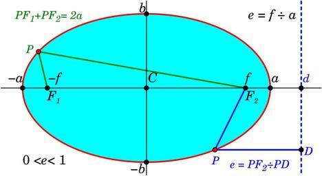 | Keywords: Ellipse Properties of Directrix and String Construction.svg ellipse including<br> The distance to a focus F from the centre C is the eccentricity e multiplied by the semimajor axis a The distance from one focus to the other via any point on the ellipse P is always 2a The distance from a point P on the ellipse to a focus is always proportional to the distance to a vertical line D called the directrix The constant of proportionality is the eccentricity e The eccentricity is always between 0 and 1 At zero the ellispe becomes a circle at 1 the ellipse becomes a parabola Greater than one it is a hyperbola <br> Ellipse properties> e 0 8 a 170 px b 102 px f e a 136 px d a/e 212 5 px Origin 0 px 0 px <br> Other related images <br> 150px 150px <br> These images were edited with the free open source program Inkscape Ellipse_Properties svg 2010-07-03 18 32 UTC Ellipse_Properties svg Inductiveload derivative work Dave3457 <span class signature-talk >talk</span> derivative work ElectroKid <small> </small> Inkscape 41735 2421 U Krishnavedala Simplied and foci where in the wrong place dave3457 Ellipse_Properties svg cc-zero cc-pd Ellipses |