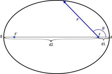 Keywords: EllipseInPolarCoords2.svg Keplerellipse <math>A \ d1 \cdots \mathrm Periapsis </math> <math>B \ d2 \cdots \mathrm Apoapsis </math> Own 2006-04-07 2008-02-03 Stanmar modified W B Image EllipseInPolarCoords svg Ellipses Celestial mechanics