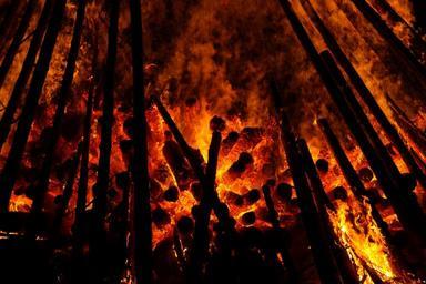 Keywords: embers glow wood burn holzstapel glow oven heat wave hot midsummer fire blaze flame red yellow dark night solstice hell hell fire