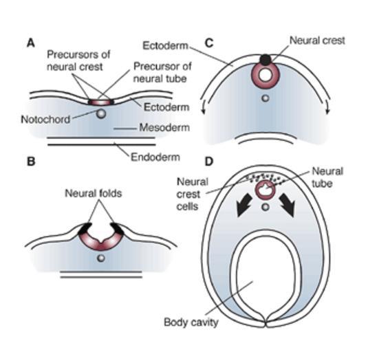 | Keywords: Embryonic Development CNS.png en Formation of the neural tube cross view Early in an embryo ™s development a strip of specialized cells called the notochord A induces the cells of the ectoderm directly above it to become the primitive nervous system i e neuroepithelium The neuroepithelium then wrinkles and folds over B As the tips of the folds fuse together a hollow tube i e the neural tube forms C ”the precursor of the brain and spinal cord Meanwhile the ectoderm and endoderm continue to curve around and fuse beneath the embryo to create the body cavity completing the transformation of the embryo from a flattened disk to a three “dimensional body Cells originating from the fused tips of the neuroectoderm i e neural crest cells migrate to various locations throughout the embryo where they will initiate the development of diverse body structures D Researchers investigating fetal alcohol syndrome have extensively studied neural crest cells because they are particularly sensitive to alcohol “induced injury and cell death 2012-04-04 http //www niaaa nih gov/Resources/GraphicsGallery/FetalAlcoholSyndrome/Pages/Embryonic aspx Source Goodlett C R and Horn K H Mechanisms of alcohol “induced damage to the developing nervous system Alcohol Research Health 25 3 175 “184 2001 PD-USGov Uploaded with UploadWizard Embryology Neural crest Original upload log wikitable - - 2012-04-04 18 33 04 350 × 325 23577 bytes Bobjgalindo <nowiki></nowiki> |