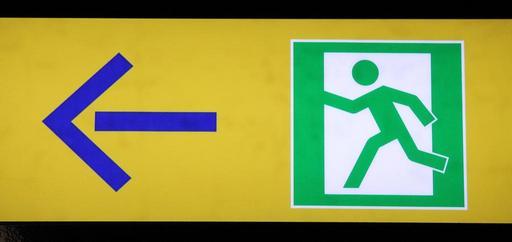 Keywords: emergency exit escape route rescue door emergency brand disaster way out yellow blue green white icon escape next arrow