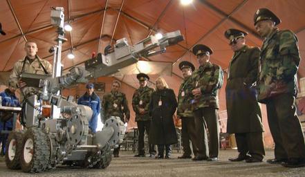 | Keywords: Emergency Responders Show Off Skills and Equipment DVIDS18100.jpg en Senior Airman Robin Cunningham controls the mechanical arm of an explosive ordinance disposal robot for representatives of the Kyrgyz Republic emergency responders on 18 March 2006 Previously Manas Air Base representatives of emergency responders were invited and attended a demonstration of Bishkek metropolitan area emergency response units Senior Airman Cunningham an explosive ordinance disposal specialist is a native Chetek Wisconsin and deployed to the 376th Expeditionary Civil Engineering Squadron Manas Air Base Kyrgyz Republic and assigned to 509th Civil Engineering Squadron Whiteman Air Force Base Mo U S Air Force photo/Master Sgt Lance Cheung <br>Unit U S Air Forces Central Command Public Affairs 2006-03-18 Lance Cheung https //www dvidshub net/image/18100/emergency-responders-show-off-skills-and-equipment 18100 2006-04-11 15 38 MANAS AIR BASE KG PD-USGov Whiteman Air Force Base Images from DoD uploaded by Fæ EOD robots |