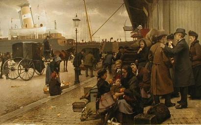 | Keywords: Emigrants at Larsens Plads (1890).jpg en Painted by Edvard Petersen it shows a scene of Danish emigrants at Larsen ™s Plads leaving for America together with their relatives saying goodbye Larsen ™s Plads was a site in in the Port of Copenhagen located where Amaliehaven lies today from where many Danish people set off to America This westbound route started off at Copenhagen calling at Kristiania Oslo and Kristiansand before crossing the Atlantic to New York ARoS Aarhus Museum of Art Creator Edvard Petersen 1890 <gallery>File Udvandrere pÃ¥ Larsens Plads jpg</gallery> PD-old-100 Edvard Petersen Larsens Plads Thingvalla Line Paintings of Copenhagen Emigration in art 1890 Immigrants to the United States from Denmark Danish American history Port of Copenhagen in art |