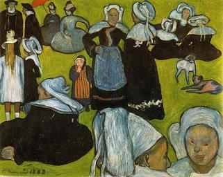 | Keywords: Émile Bernard À Gauguin 1888.jpg artwork Creator Émile Bernard title Breton Women in the Meadow Bretonnes dans la prairie verte 1888 Pardon de Pont-Aven 1888-08 oil on canvas cm 93 74 Josefowitz collection http //books google com/books id v7fgpBJM_nQC pg PA262 dq Bernard+ 22Breton+Women+in+the+Meadow 22 hl en ei i69XTZvtDYbVsgaLhNGlCw sa X oi book_result ct result resnum 1 ved 0CC0Q6AEwADgK v onepage q Bernard 20 22Breton 20Women 20in 20the 20Meadow 22 f false Lausanne Switzerland Bernard exchanged thisone with Gaugin who brought it to Arles in autumn 1888 when joining Van Gogh who was totally fond of this style Van Gogh painted a copy in watercolour to inform his brother Theo about it http //www historiasztuki com pl/62_W19_MAL_BERNARD html www historiasztuki com pl Other versions cf Van Gogh's watercolour copy w File Breton Women jpg PD-old-70-1923 1888 paintings Bretagne by Émile Bernard Traditional costumes of Bretagne in art Paintings of Pont-Aven Pardon breton 1888 in Bretagne Traditional costumes from Pont-Aven |