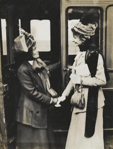 MAKE A MEME View Large Image the women's library thewomenslibrary suffragette suffrage women hires 7JCC/O/02/086 Photograph, printed, paper, monochrome, Emmeline Pankhurst shaking hands with Constance Lytton in front of the door of a railway carriage; manuscript ...