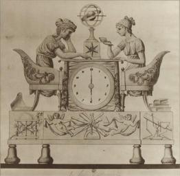 | Keywords: Empire clock print.png en French Empire clock print of a drawing depicting a mother and daughter The design of this French Empire clock can be attributed to Jean-André Reiche 1752-1817 Reiche born in Leipzig worked in Paris and created several clock designs for the Emperor Napoleon This clock depicting an astronomy lesson between a mother and daughter was among them Female scholarship was a favored motif of Reiche; he produced several clock designs with women reading and studying The print is likely a copy of Reiche's original design for the clock Many of Reiche's designs for Napoleon are held at the Bibliotheque Nationale de France in Paris including his series of female scholars This design was given in 1807 A faint title underneath the drawing identifies it as La Leçon d'astronomie or The Astronomy Lesson http //content delivra com/etapcontent/ClassicalAmericanHomesPrese/clock_drawingrepro jpg author century 19 French Empire style mantel clock Sketches PD-old-100 |