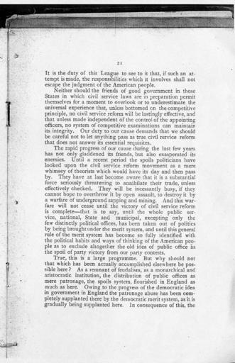 | Keywords: Encouragements and Warnings p21.JPG en Speech of National Civil Service Reform League president Carl Schurz before its annual meeting of December 10 1896 in Philadelphia p 21 Single page scan 200 dpi Carl Schurz Encouragements and Warnings National Civil Service Reform League 1896; courtesy of Boston Public Library Carl Schurz 1896-12-10 PD-Old Encouragements and Warnings Page Images | ||||