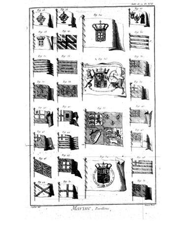 | Keywords: Encyclopedie volume 6-144.png Planches de l'Encyclopédie de Diderot et d'Alembert volume 6 Flag chart from French Encyclopédie part 2 of 8 showing Portugal William III of England 1688-1689 Hanoverian royal standard etc Two of the flags read For the Protestant Religion antsic Liberty of England Fig 40 is an incorrect version of the New England pine tree flag Encyclopédie flag chart 1 2 3 4 5 6 7 8 Key summarized in translation from captions in images File Encyclopedie volume 6-108 png and File Encyclopedie volume 6-109 png 24 Royal flag of Portugal 25 White flag of Portugal with armillary sphere 26 Other white flag of Portugal with armillary sphere 27 Other Portugal 28 War flag of Portugal 29 Other Portugal 30 Portuguese merchant 31 Portugal 32 Royal flag of William III of England with For the Protestant Religion antsic Liberty of England motto 33 Heraldic banner of George I of England 34 British royal 35 Red flag with For the Protestant Religion antsic Liberty of England motto 36 British red ensign 37 British admiral 38 British admiral new 39 English red ensign old 40 Incorrect version of New England pine-tree flag with globe instead of pine tree 41 Other English cross of st George and three lions arms 42 British blue ensign 43 English red ensign variation 44 Squadron flag with 13 red and white horizontal stripes 45 British white ensign 46 Yacht flag 47 Guinea yacht flag 48 East India Company 49 Ireland red saltire on white not referred to as St Patrick's cross 50 England red cross on white St George's cross 51 Bugie Encyclopédie ou Dictionnaire raisonné des sciences des arts et des métiers volume 6 PD-old Flag charts |
