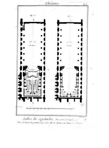 | Keywords: Encyclopedie volume 9-053.png Ground-level floor plan and plan at the level of the first loges of the Salle des Machines in the Tuileries Palace in Paris Diderot's Encyclopédie vol 10 Théâtres Salle des Machines plate 1 1662 inauguration of the theatre http //gallica bnf fr/ark /12148/bpt6k50564m/f54 image r langEN Gallica designer Théâtre Creator Gaspare Vigarani <br/> designer Planche probably <br/> engraver Robert Bénard <gallery> File Encyclopedie volume 9-053 adjusted jpg </gallery> Book Encyclopedie Planches 9 052 054 PD-old-100-1923 Encyclopédie ou Dictionnaire raisonné des sciences des arts et des métiers volume 9 053 Théâtre des Tuileries 1662 Gaspare Vigarani Gabriel-Pierre-Martin Dumont Engravings by Robert Bénard |