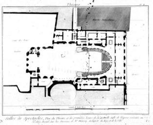 | Keywords: Encyclopedie volume 9-056.png Floor plan at the level of the first loges of the Théâtre de l'Opéra on the rue Saint-Honoré Palais-Royal Paris also known as Moreau's opera house Diderot's Encyclopédie vol 10 Théâtres Salle de l'Opéra plate 2 1770 inauguration of the theatre http //gallica bnf fr/ark /12148/bpt6k50564m/f57 image r langEN Gallica architect Creator Pierre-Louis Moreau-Desproux engraver Robert Bénard Book Encyclopedie Planches 9 055 057 PD-old-100-1923 Encyclopédie ou Dictionnaire raisonné des sciences des arts et des métiers volume 9 056 Seconde salle du Palais-Royal Engravings by Robert Bénard |