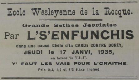 | Keywords: Enfuntchis La Rocque 17 Janvyi 1935.jpg Advertisement for theatrical play performance 17 January 1935 by Jèrriais acting troupe L's Enfuntchis Advertisement from newspaper Les Chroniques de Jersey January 1935 Own 2007-10-14 Man vyi Advertisements in Jersey Jèrriais 17 January Newspapers of Jersey Grouville 1935 advertisements 1935 in theatre Theatre of Jersey January 1935 | ||||