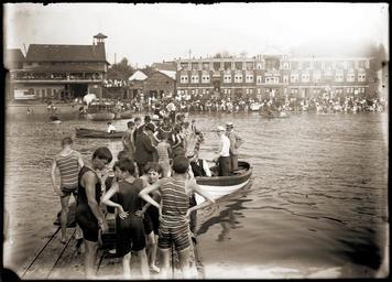 | Keywords: monochrome photo border English Bay swimming race Date: 190- VPL 5454 Philip Timms photograph Content: People on the beach and in boats. First Beach Pavilion (taller building, left), the Crescent (lower building, left) and another bathhouse (built in 1905), right with Simpson's rental boat house in between. Boys and men line a platform in the water, foreground. Topic: Boats and boating Swimming More information on our historical photograph collection: www.vpl.ca/historicalphotos English Bay swimming race Date: 190- VPL 5454 Philip Timms photograph Content: People on the beach and in boats. First Beach Pavilion (taller building, left), the Crescent (lower building, left) and another bathhouse (built in 1905), right with Simpson's rental boat house in between. Boys and men line a platform in the water, foreground. Topic: Boats and boating Swimming More information on our historical photograph collection: www.vpl.ca/historicalphotos |