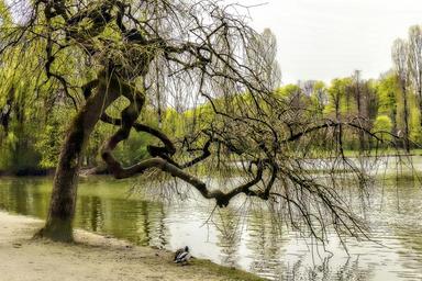 Keywords: english garden munich germany bavaria mystic pond lake water trees gnarled tree park landmark attraction europe tourism landscape nature spring season