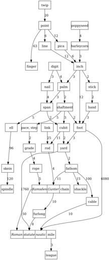 Keywords: English length units graph.svg Graph showing the relations of classic English units of length made from scratch with Graphwiz based on data from en English unit 2007-09-26 Christoph Päper PD thumb Source <source lang dot > digraph Distance bgcolor transparent ; node shape box style filled color black fillcolor white; subgraph clusterCommon inch -> foot label 12; foot -> yard label 3; yard -> mile label 1760; subgraph Typography twip -> point label 20; point -> line label 6; point -> pica label 12; pica -> inch label 6; line -> inch label 12; mil US ;thou UK -> inch label 1000; point -> finger label 63; line -> barleycorn style invis; poppyseed -> barleycorn label 4; barleycorn -> inch label 3; inch -> finger label 7/8 ; foot -> rope label 20; grade -> rope label 4; subgraph Textile ell -> skein label 96; yard -> skein label 120; skein -> spindle label 120; inch -> stick label 2; stick -> hand label 2; inch -> palm label 3; digit -> palm label 4; digit -> nail label 3; nail -> span label 4; palm -> shaftment label 2; palm -> span label 3; hand -> foot label 3; shaftment -> foot label 2; shaftment -> cubit label 3; span -> cubit label 2; span -> ell label 5; cubit -> yard label 2; subgraph Military Roman pace label pace step ; foot -> pace label 2 5 ; shaftment -> pace label 5; pace -> grade label 2; grade -> rope label 4; grade -> mile roman label 1000; yard -> fathom label 2; cubit -> rod label 11; chain shape record label <all> chain <ramsden> Ramsden <gunter> Gunter ; fathom -> chain gunter label 11; rod -> chain gunter label 4; link shape record label <all> link <gunter> Gunter // <ramsden> Ramsden ; foot -> chain ramsden label 100; rope -> chain ramsden label 5; link ramsden -> chain ramsden label 100; link -> rod label 25; chain gunter -> furlong label 10; furlong -> mile statute label 8; chain ramsden -> mile roman label 50; mile shape record label <roman> Roman <statute> statute <sea> nautic <all> mile mile all -> league label 3; subgraph nautic fathom -> shackle label 15; shackle -> cable style invis; fathom -> cable label 100; cable -> mile sea label 10; foot -> mile sea label 6080; </source> Units of length British Imperial units ImageNote 1 385 105 122 69 605 1433 2 fact ImageNoteEnd 1 ImageNote 3 50 1261 86 67 605 1433 2 this is interesting but the Roman mile was never at any point an imperial or customary unit ImageNoteEnd 3 ImageNote 4 191 1256 72 74 605 1433 2 not an actual name ImageNoteEnd 4