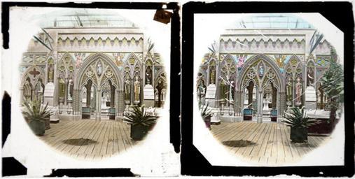 | Keywords: great exhibition greatexhibition crystal palace crystalpalace english medieval court englishmedievalcourt sydenham 3d stereo steroview vintage antique black and white blackandwhite b&w bw whatsthatpicture public domain publicdomain black and white An intriguing pair of lantern slides of the English Medieval Court from the Great Exhibition. A few things are unclear. Firstly, what date were these taken? And as such are they from the original exhibition, or after the 'Crystal Palace' was moved to Sydenham (I'm not sure if all the exhibits were moved, as well as the building)? And in either case, are they contemporary images or made later from a printed stereoview or negatives? The fact that these are 3.5" square would suggest that they are older than the now conventional 3.25" format. An intriguing pair of lantern slides of the English Medieval Court from the Great Exhibition. A few things are unclear. Firstly, what date were these taken? And as such are they from the original exhibition, or after the 'Crystal Palace' was moved to Sydenham (I'm not sure if all the exhibits were moved, as well as the building)? And in either case, are they contemporary images or made later from a printed stereoview or negatives? The fact that these are 3.5" square would suggest that they are older than the now conventional 3.25" format. |