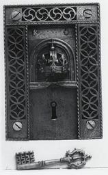 | Keywords: English - Rim Lock and Key from a Chest Made for Henry VIII - Walters 5290, 5291.jpg This splendid rim lock for a chest bears the emblems of King Henry VIII of England and was made by a court locksmith The royal emblems include the crown with two fleurs-de-lis flanking the cross of St George The double rose behind the crown is an emblem of the Tudors Henry's family combining the white rose emblem of the house of York and the red rose of the rival house of Lancaster The rivalry was resolved by the marriage of King Henry VII of the Lancaster line and Elizabeth of York establishing the house of Tudor Their son Henry VIII was hailed as the unifier of England between 1500 1510 Tudor pierced and cast iron 52 91 cm 25 5 17 7 ; 52 90 cm 13 5 accession number 52 90 52 91 77481 Thomas Astle English antiquarian England Horace Walpole Strawberry Hill Middlesex England before 1788 by gift Sale Strawberry Hill May 19 1842 lot 91 Mr Webb of Bond Street Jeffrey Whitehead London Harding London William T or Henry Walters Baltimore before 1931 Acquired by Henry Walters place of origin England United Kingdom Walters Art Museum license Medieval metalwork in the Walters Art Museum Gothic art in the United Kingdom Media contributed by the Walters Art Museum needs category review Henry VIII of England |