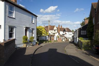 Keywords: english village street scene eclectic architecture telegraph pole overhead phone lines blue sky