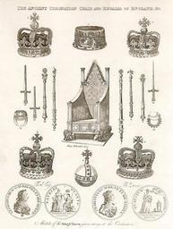 Keywords: EnglishCoronationRegalia.jpg thumb Index of the coronation items 1 en Imperial State Crown<br> 2 Mary of Modena's Diadem<br> 3 <br> 4 One of the four Swords borne before the monarch <br> 5 Sword of Mercy<br> 6 <br> 7 The Sovereign's Staff St Edward's Staff <br> 8 Sovereign's Ring<br> 9 King Edward's Chair the Coronation chair <br> 10 <br> 11 Sceptre with the Dove<br> 12 <br> 13 One of the four Swords borne before the monarch <br> 14 Queen-Consort's Ring<br> 15 St Edward's Crown<br> 16 Sovereign's Orb<br> 17 <br> thumb Index der Gegenstände Diadem der Mary von Modena Eines der vier Schwerter die dem Monarchen vorangetragen werden Schwert der Gnade Herrscherring Edwardsthron der Krönungsthron Sankt Edwards Stab Szepter mit der Taube Eines der vier Schwerter Ring des Königingemahls de Edwardskrone Reichsapfel Hume's History of England 1814 http //www antiqueprints com/Prints/historic_scenes html 1814 Author PD-old-100 page on en wikipedia Crown jewels of the United Kingdom King Edward's Chair
