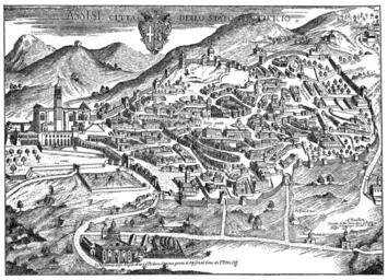 | Keywords: Engraved panoramic view of Assisi (Assisi città dello stato pontificio).jpg LargeImage Assisi entitled Assisi città dello stato pontificio Assisi a city of the Papal state Reproduced in the book Duecento Hohes Mittelalter in Italien by Hélène Nolthenius German edition Würzburg 1957 after page 304 Neither the artist nor the date of the engraving is given in the book I think it ™s an Italian 16th century engraving but please correct me if you know more ” Image slightly edited to remove traces of folds and dog ™s ears Assisi betitelt Assisi città dello stato pontificio žAssisi eine Stadt des Kirchenstaates Reproduziert in dem Buch Duecento Hohes Mittelalter in Italien von Hélène Nolthenius deutsche Ausgabe Würzburg 1957 nach Seite 304 Weder der Künstler noch das Datum der Radierung werden in dem Buch genannt Ich schätze dass es sich um eine italienische Radierung des 16 Jahrhunderts handelt aber korrigiere das bitte wenn Du Genaueres weißt “ Bild leicht retuchiert um Spuren von Falzen und Eselsohren zu beseitigen Veduta storica di Assisi e dei monumenti intitolata Assisi città dello stato pontificio Incisione del settecento Scanned by Aristeas Creator of the engraving unknown; image scanned by Aristeas century 16 estimated PD-old-100 ImageNote 1 748 2426 1427 747 9206 6635 2 Basilica of San Francesco d'Assisi ImageNoteEnd 1 ImageNote 2 92 2852 1818 655 9206 6635 2 Sacro Convento Franciscan monastery ImageNoteEnd 2 ImageNote 3 2255 5198 932 1069 9206 6635 2 Basilica of Santa Maria degli Angeli ImageNoteEnd 3 ImageNote 4 7307 2944 771 540 9206 6635 2 Basilica di Santa Chiara and monastery ImageNoteEnd 4 ImageNote 5 6318 2277 483 425 9206 6635 2 Assisi Cathedral Cattedrale di San Rufino di Assisi ImageNoteEnd 5 ImageNote 6 5892 2461 506 310 9206 6635 2 Piazza del Duomo ImageNoteEnd 6 ImageNote 7 4891 2472 437 345 9206 6635 2 Minerva Temple or Santa Maria sopra Minerva church ImageNoteEnd 7 ImageNote 8 6766 1345 414 471 9206 6635 2 Ruins of Roman amphitheatre ImageNoteEnd 8 ImageNote 9 8631 4151 495 736 9206 6635 2 San Damiano church and monastery ImageNoteEnd 9 ImageNote 10 4730 2737 1185 333 9206 6635 2 Piazza del Comune old name Piazza grande ImageNoteEnd 10 ImageNote 11 4730 1035 598 609 9206 6635 2 Rocca maggiore ImageNoteEnd 11 ImageNote 12 4212 3979 529 678 9206 6635 2 Chiesa di San Pietro ImageNoteEnd 12 16th-century engravings Assisi in art Engravings of cities Old maps of Umbria |