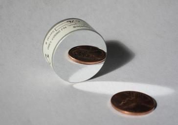 | Keywords: Enhanced aluminum coated first surface mirror on an optical flat.JPG en An optical flat that has been coated with aluminum by vacuum deposition to make a first-surface mirror The coating is enhanced with dielectric coatings both improving the reflectance and protecting the soft aluminum from damage Both sides of the optical flat were certified to be polished to <math>\lambda</math>/20 That's 1/20 of the wavelength of the helium-neon laser used in the interferometer which equates to a surface deviation of no more than 31 6 nanometers The substrate is quartz measuring 1 inch in diameter by 1/2 inch thick 2012-06-20 own Zaereth cc-zero Uploaded with UploadWizard Optics Mirrors |