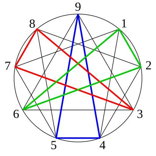 Keywords: Enneagram Horney groups.svg Enneagram symbol with Horney's groups of spontaneous reaction Blue 9 5 4 withdrawing Red 3 7 8 aggressive Green 6 1 2 compliant own 2014-02-25 Life of Riley Basis This file is based upon and is a vector replacement for File Enneagram Horney groups jpg by User Virtutepetens JPEG Basis 150px Remarks valid SVG Inkscape-hand Enneagram Personality