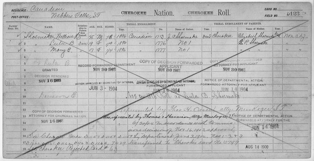 | Keywords: Enrollment for Cherokee Census Card D123 - NARA - 251871.tif Local identifier 75-53A-CHEROKEE D123 Department of the Interior Office of Indian Affairs Office of the Commissioner to the Five Civilized Tribes 1893 - 1914 NARA's Southwest Region Fort Worth NRFA 1400 John Burgess Drive Fort Worth TX 76140 Record group Record Group 75 Records of the Bureau of Indian Affairs 1793 - 1999 Record group ARC 404 Enrollment Cards compiled 1898 - 1914 Series ARC 251747 Variant control numbers NAIL Control Number NRFF-75-53A-17389<br /> NAIL Control Number NRFF-75-53A-17397<br /> NAIL Control Number NRFF-75-53A-17402<br /> NAIL Control Number NRFF-75-53A-17405<br /> NAIL Control Number NRFF-75-53A-17415<br /> NAIL Control Number NRFF-75-53A-17420<br /> NAIL Control Number NRFF-75-53A-CHEROKEE D123 General notes Scope and content Name Elizabeth Shoemake Type Parent Sex Female Name Ja Shoemake Type Parent Sex Male Name Lulu B Shoemake Type Doubtful Age 19 Sex Female Degree Indian Blood 1/4 City of Residence Webber Falls Name Mary E Shoemake Type Doubtful Age 17 Sex Female Degree Indian Blood 1/4 City of Residence Webber Falls Name Sp Shoemake Type Parent Sex Female Name William H Shoemake Type Doubtful Age 75 Sex Male Degree Indian Blood 1/8 City of Residence Webber Falls File unit File unit ARC yes <gallery> File Enrollment_for_Cherokee_Census_Card_D123_-_NARA_-_251871 tif tif File Enrollment_for_Cherokee_Census_Card_D123_-_NARA_-_251871 jpg jpg </gallery> NARA-cooperation PD-USGov Cherokee census cards NARA TIF images with categorized JPGs |