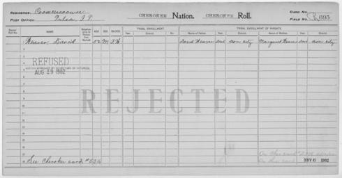 | Keywords: Enrollment for Cherokee Census Card R695 - NARA - 259758.tif Scope and content Name David Weaver Type Rejected Age 52 Sex Male Degree Indian Blood Intermarried White City of Residence Tulsa Name David Weaver Type Parent Sex Male Name Margaret Weaver Type Parent Sex Female General notes 259758 Local identifier 75-53A-CHEROKEE R695 Department of the Interior Office of Indian Affairs Office of the Commissioner to the Five Civilized Tribes 1893 - 1914 NARA's Southwest Region Fort Worth NRFA 1400 John Burgess Drive Fort Worth TX 76140 Record group Record Group 75 Records of the Bureau of Indian Affairs 1793 - 1999 Record group ARC 404 Enrollment Cards compiled 1898 - 1914 Series ARC 251747 File unit File unit ARC Variant control numbers NAIL Control Number NRFF-75-53A-20958<br /> NAIL Control Number NRFF-75-53A-20959<br /> NAIL Control Number NRFF-75-53A-20984<br /> NAIL Control Number NRFF-75-53A-CHEROKEE R695 yes Other versions <gallery> File Enrollment_for_Cherokee_Census_Card_R695_-_NARA_-_259758 tif tif File Enrollment_for_Cherokee_Census_Card_R695_-_NARA_-_259758 jpg jpg </gallery> NARA-cooperation PD-USGov Cherokee census cards NARA TIF images with categorized JPGs |