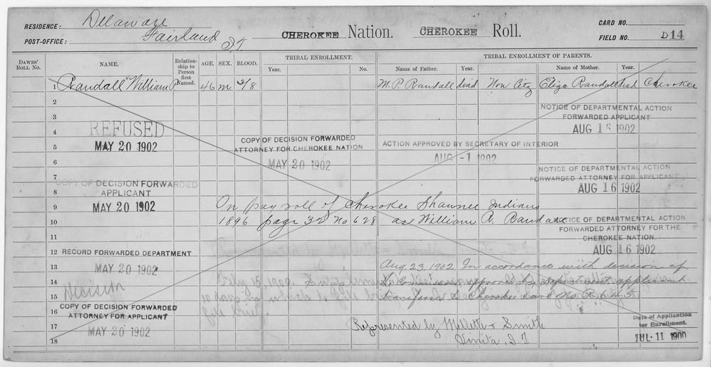 | Keywords: Enrollment for Cherokee Census Card D14 - NARA - 251762.tif Local identifier 75-53A-CHEROKEE D14 Department of the Interior Office of Indian Affairs Office of the Commissioner to the Five Civilized Tribes 1893 - 1914 NARA's Southwest Region Fort Worth NRFA 1400 John Burgess Drive Fort Worth TX 76140 Record group Record Group 75 Records of the Bureau of Indian Affairs 1793 - 1999 Record group ARC 404 Enrollment Cards compiled 1898 - 1914 Series ARC 251747 Variant control numbers NAIL Control Number NRFF-75-53A-15428<br /> NAIL Control Number NRFF-75-53A-15454<br /> NAIL Control Number NRFF-75-53A-15460<br /> NAIL Control Number NRFF-75-53A-CHEROKEE D14 General notes Scope and content Name Eliza Randall Type Parent Sex Female Name Mp Randall Type Parent Sex Male Name William P Randall Type Doubtful Age 46 Sex Male Degree Indian Blood 3/8 City of Residence Fairland File unit File unit ARC yes <gallery> File Enrollment_for_Cherokee_Census_Card_D14_-_NARA_-_251762 tif tif File Enrollment_for_Cherokee_Census_Card_D14_-_NARA_-_251762 jpg jpg </gallery> NARA-cooperation PD-USGov Cherokee census cards NARA TIF images with categorized JPGs |