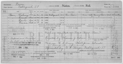 | Keywords: Enrollment for Cherokee Census Card R711 - NARA - 259774.tif Scope and content Name Earle Boon Type Rejected Age 16 Sex Male Degree Indian Blood 1/8 City of Residence Tahlequah Name Emma Boon Type Rejected Age 14 Sex Female Degree Indian Blood 1/8 City of Residence Tahlequah Name Frank Boon Type Rejected Age 18 Sex Male Degree Indian Blood 1/8 City of Residence Tahlequah Name Nancy Boon Type Parent Sex Female Name Volney Boon Type Rejected Age 20 Sex Male Degree Indian Blood 1/8 City of Residence Tahlequah Name William Boon Type Parent Sex Male General notes 259774 Local identifier 75-53A-CHEROKEE R711 Department of the Interior Office of Indian Affairs Office of the Commissioner to the Five Civilized Tribes 1893 - 1914 NARA's Southwest Region Fort Worth NRFA 1400 John Burgess Drive Fort Worth TX 76140 Record group Record Group 75 Records of the Bureau of Indian Affairs 1793 - 1999 Record group ARC 404 Enrollment Cards compiled 1898 - 1914 Series ARC 251747 File unit File unit ARC Variant control numbers NAIL Control Number NRFF-75-53A-2037<br /> NAIL Control Number NRFF-75-53A-2038<br /> NAIL Control Number NRFF-75-53A-2040<br /> NAIL Control Number NRFF-75-53A-2041<br /> NAIL Control Number NRFF-75-53A-2043<br /> NAIL Control Number NRFF-75-53A-2044<br /> NAIL Control Number NRFF-75-53A-CHEROKEE R711 yes Other versions <gallery> File Enrollment_for_Cherokee_Census_Card_R711_-_NARA_-_259774 tif tif File Enrollment_for_Cherokee_Census_Card_R711_-_NARA_-_259774 jpg jpg </gallery> NARA-cooperation PD-USGov Cherokee census cards NARA TIF images with categorized JPGs |