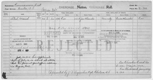 | Keywords: Enrollment for Cherokee Census Card R793 - NARA - 259856.tif Scope and content Name James Alexander Type Parent Sex Male Name Louisa Alexander Type Parent Sex Female Name Maud Stell Type Rejected Age 26 Sex Female Degree Indian Blood 1/64 City of Residence Vinita General notes 259856 Local identifier 75-53A-CHEROKEE R793 Department of the Interior Office of Indian Affairs Office of the Commissioner to the Five Civilized Tribes 1893 - 1914 NARA's Southwest Region Fort Worth NRFA 1400 John Burgess Drive Fort Worth TX 76140 Record group Record Group 75 Records of the Bureau of Indian Affairs 1793 - 1999 Record group ARC 404 Enrollment Cards compiled 1898 - 1914 Series ARC 251747 File unit File unit ARC Variant control numbers NAIL Control Number NRFF-75-53A-18333<br /> NAIL Control Number NRFF-75-53A-357<br /> NAIL Control Number NRFF-75-53A-358<br /> NAIL Control Number NRFF-75-53A-CHEROKEE R793 yes Other versions <gallery> File Enrollment_for_Cherokee_Census_Card_R793_-_NARA_-_259856 tif tif File Enrollment_for_Cherokee_Census_Card_R793_-_NARA_-_259856 jpg jpg </gallery> NARA-cooperation PD-USGov Cherokee census cards NARA TIF images with categorized JPGs |