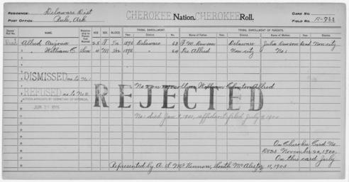 | Keywords: Enrollment for Cherokee Census Card R944 - NARA - 260007.tif Scope and content Name Arizona Allred Type Rejected Age 25 Sex Female Degree Indian Blood 1/16 City of Residence Rule Arejected Name Lee Allred Type Parent Sex Male Name William C Allred Type Rejected Age 4 Sex Male Degree Indian Blood 1/32 City of Residence Rule Arejected Name Julia Dawson Type Parent Sex Female Name T M Dawson Type Parent Sex Male General notes 260007 Local identifier 75-53A-CHEROKEE R944 Department of the Interior Office of Indian Affairs Office of the Commissioner to the Five Civilized Tribes 1893 - 1914 NARA's Southwest Region Fort Worth NRFA 1400 John Burgess Drive Fort Worth TX 76140 Record group Record Group 75 Records of the Bureau of Indian Affairs 1793 - 1999 Record group ARC 404 Enrollment Cards compiled 1898 - 1914 Series ARC 251747 File unit File unit ARC Variant control numbers NAIL Control Number NRFF-75-53A-464<br /> NAIL Control Number NRFF-75-53A-465<br /> NAIL Control Number NRFF-75-53A-466<br /> NAIL Control Number NRFF-75-53A-5189<br /> NAIL Control Number NRFF-75-53A-5205<br /> NAIL Control Number NRFF-75-53A-CHEROKEE R944 yes Other versions <gallery> File Enrollment_for_Cherokee_Census_Card_R944_-_NARA_-_260007 tif tif File Enrollment_for_Cherokee_Census_Card_R944_-_NARA_-_260007 jpg jpg </gallery> NARA-cooperation PD-USGov Cherokee census cards NARA TIF images with categorized JPGs |