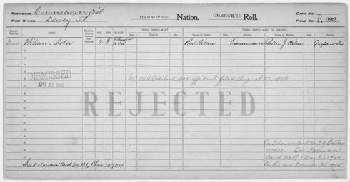 | Keywords: Enrollment for Cherokee Census Card R992 - NARA - 260055.tif Scope and content Name Ida Wilson Type Rejected Age 2 Sex Female Degree Indian Blood 1/2 City of Residence Dewey Name Reed Wilson Type Parent Sex Male Name Rollie J Wilson Type Parent Sex Female General notes 260055 Local identifier 75-53A-CHEROKEE R992 Department of the Interior Office of Indian Affairs Office of the Commissioner to the Five Civilized Tribes 1893 - 1914 NARA's Southwest Region Fort Worth NRFA 1400 John Burgess Drive Fort Worth TX 76140 Record group Record Group 75 Records of the Bureau of Indian Affairs 1793 - 1999 Record group ARC 404 Enrollment Cards compiled 1898 - 1914 Series ARC 251747 File unit File unit ARC Variant control numbers NAIL Control Number NRFF-75-53A-21916<br /> NAIL Control Number NRFF-75-53A-22025<br /> NAIL Control Number NRFF-75-53A-22037<br /> NAIL Control Number NRFF-75-53A-CHEROKEE R992 yes Other versions <gallery> File Enrollment_for_Cherokee_Census_Card_R992_-_NARA_-_260055 tif tif File Enrollment_for_Cherokee_Census_Card_R992_-_NARA_-_260055 jpg jpg </gallery> NARA-cooperation PD-USGov Cherokee census cards NARA TIF images with categorized JPGs |