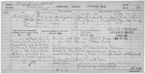 | Keywords: Enrollment for Cherokee Census Card D34 - NARA - 251782.jpg Scope and content Name Nancyam Forbes Type Parent Sex Female Name Ora Forbes Type Doubtful Age 6 Sex Female Degree Indian Blood 1/32 City of Residence Westville Name Rasmus Forbes Type Doubtful Age 4 Sex Male Degree Indian Blood 1/32 City of Residence Westville Name Robert J Forbes Type Doubtful Age 34 Sex Male Degree Indian Blood 1/16 City of Residence Westville Name William Forbes Type Parent Sex Male Name Sarah Pilgrim Type Parent Sex Female Name Tom Pilgrim Type Parent Sex Male General notes 251782 Local identifier 75-53A-CHEROKEE D34 Department of the Interior Office of Indian Affairs Office of the Commissioner to the Five Civilized Tribes 1893 - 1914 NARA's Southwest Region Fort Worth NRFA 1400 John Burgess Drive Fort Worth TX 76140 Record group Record Group 75 Records of the Bureau of Indian Affairs 1793 - 1999 Record group ARC 404 Enrollment Cards compiled 1898 - 1914 Series ARC 251747 File unit File unit ARC Variant control numbers NAIL Control Number NRFF-75-53A-15103<br /> NAIL Control Number NRFF-75-53A-15105<br /> NAIL Control Number NRFF-75-53A-6676<br /> NAIL Control Number NRFF-75-53A-6677<br /> NAIL Control Number NRFF-75-53A-6680<br /> NAIL Control Number NRFF-75-53A-6682<br /> NAIL Control Number NRFF-75-53A-6687<br /> NAIL Control Number NRFF-75-53A-CHEROKEE D34 Other versions <gallery> File Enrollment_for_Cherokee_Census_Card_D34_-_NARA_-_251782 tif tif File Enrollment_for_Cherokee_Census_Card_D34_-_NARA_-_251782 jpg jpg </gallery> NARA-cooperation PD-USGov Cherokee census cards |