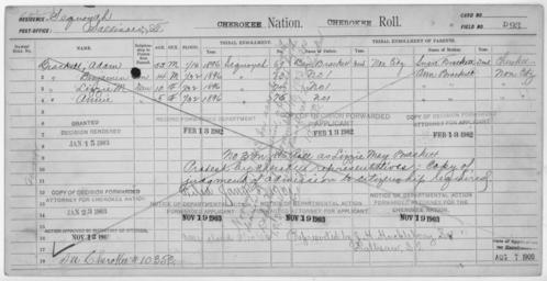 | Keywords: Enrollment for Cherokee Census Card D93 - NARA - 251841.jpg Scope and content Name Adam Brackett Type Doubtful Age 55 Sex Male Degree Indian Blood 1/16 City of Residence Sallisaw Name Ann Brackett Type Parent Sex Female Name Annie Brackett Type Doubtful Age 5 Sex Female Degree Indian Blood 1/32 City of Residence Sallisaw Name Ben Brackett Type Parent Sex Male Name Benjamin Brackett Type Doubtful Age 14 Sex Male Degree Indian Blood 1/32 City of Residence Sallisaw Name Lizzie M Brackett Type Doubtful Age 10 Sex Female Degree Indian Blood 1/32 City of Residence Sallisaw Name Susie Brackett Type Parent Sex Female General notes 251841 Local identifier 75-53A-CHEROKEE D93 Department of the Interior Office of Indian Affairs Office of the Commissioner to the Five Civilized Tribes 1893 - 1914 NARA's Southwest Region Fort Worth NRFA 1400 John Burgess Drive Fort Worth TX 76140 Record group Record Group 75 Records of the Bureau of Indian Affairs 1793 - 1999 Record group ARC 404 Enrollment Cards compiled 1898 - 1914 Series ARC 251747 File unit File unit ARC Variant control numbers NAIL Control Number NRFF-75-53A-2127<br /> NAIL Control Number NRFF-75-53A-2129<br /> NAIL Control Number NRFF-75-53A-2130<br /> NAIL Control Number NRFF-75-53A-2134<br /> NAIL Control Number NRFF-75-53A-2137<br /> NAIL Control Number NRFF-75-53A-2145<br /> NAIL Control Number NRFF-75-53A-2164<br /> NAIL Control Number NRFF-75-53A-CHEROKEE D93 Other versions <gallery> File Enrollment_for_Cherokee_Census_Card_D93_-_NARA_-_251841 tif tif File Enrollment_for_Cherokee_Census_Card_D93_-_NARA_-_251841 jpg jpg </gallery> NARA-cooperation PD-USGov Cherokee census cards |