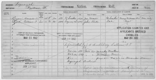 | Keywords: Enrollment for Cherokee Census Card D126 - NARA - 251874.jpg Scope and content Name Amanda A Dunn Type Doubtful Age 44 Sex Female Degree Indian Blood 1/2 City of Residence Muldrow Name John Kirk Type Parent Sex Male Name William P Kirk Type Doubtful Age 17 Sex Male Degree Indian Blood 1/2 City of Residence Muldrow Name Joe Weaver Type Parent Sex Male Name Mary M Weaver Type Parent Sex Female General notes 251874 Local identifier 75-53A-CHEROKEE D126 Department of the Interior Office of Indian Affairs Office of the Commissioner to the Five Civilized Tribes 1893 - 1914 NARA's Southwest Region Fort Worth NRFA 1400 John Burgess Drive Fort Worth TX 76140 Record group Record Group 75 Records of the Bureau of Indian Affairs 1793 - 1999 Record group ARC 404 Enrollment Cards compiled 1898 - 1914 Series ARC 251747 File unit File unit ARC Variant control numbers NAIL Control Number NRFF-75-53A-10783<br /> NAIL Control Number NRFF-75-53A-10797<br /> NAIL Control Number NRFF-75-53A-20970<br /> NAIL Control Number NRFF-75-53A-20989<br /> NAIL Control Number NRFF-75-53A-5829<br /> NAIL Control Number NRFF-75-53A-CHEROKEE D126 Other versions <gallery> File Enrollment_for_Cherokee_Census_Card_D126_-_NARA_-_251874 tif tif File Enrollment_for_Cherokee_Census_Card_D126_-_NARA_-_251874 jpg jpg </gallery> NARA-cooperation PD-USGov Cherokee census cards |