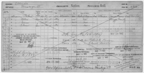 Keywords: Enrollment for Cherokee Census Card D163 - NARA - 251911.jpg Scope and content Name Elmer Brown Type By Blood Age 12 Sex Male Degree Indian Blood 1/8 City of Residence Muskogee Name Irene Brown Type By Blood Age 14 Sex Female Degree Indian Blood 1/8 City of Residence Muskogee Name Jane Brown Type Parent Sex Female Name Nellie Brown Type By Blood Age 16 Sex Female Degree Indian Blood 1/8 City of Residence Muskogee Name Robert Brown Type By Blood Age 39 Sex Male Degree Indian Blood 1/4 City of Residence Muskogee Name Robert Brown Type Parent Sex Male Name Maggie Farriety Type Parent Sex Female Name Robert Brown Type Doubtful Age 39 Sex Male Degree Indian Blood 1/4 Roll Number Not Reported Post Office Muskogee Name Nellie Brown Type Doubtful Age 16 Sex Female Degree Indian Blood 1/8 Roll Number Not Reported Post Office Muskogee Name Irene Brown Type Doubtful Age 14 Sex Female Degree Indian Blood 1/8 Roll Number Not Reported Post Office Muskogee Name Elmer Brown Type Doubtful Age 12 Sex Male Degree Indian Blood 1/8 Roll Number Not Reported Post Office Muskogee General notes 251911 Local identifier 75-53A-CHEROKEE D163 Department of the Interior Office of Indian Affairs Office of the Commissioner to the Five Civilized Tribes 1893 - 1914 NARA's Southwest Region Fort Worth NRFA 1400 John Burgess Drive Fort Worth TX 76140 Record group Record Group 75 Records of the Bureau of Indian Affairs 1793 - 1999 Record group ARC 404 Enrollment Cards compiled 1898 - 1914 Series ARC 251747 File unit File unit ARC Variant control numbers NAIL Control Number NRFF-75-53A-2442<br /> NAIL Control Number NRFF-75-53A-2471<br /> NAIL Control Number NRFF-75-53A-2481<br /> NAIL Control Number NRFF-75-53A-2564<br /> NAIL Control Number NRFF-75-53A-2580<br /> NAIL Control Number NRFF-75-53A-2581<br /> NAIL Control Number NRFF-75-53A-52957<br /> NAIL Control Number NRFF-75-53A-52958<br /> NAIL Control Number NRFF-75-53A-52959<br /> NAIL Control Number NRFF-75-53A-52960<br /> NAIL Control Number NRFF-75-53A-6274<br /> NAIL Control Number NRFF-75-53A-CHEROKEE D163 Other versions <gallery> File Enrollment_for_Cherokee_Census_Card_D163_-_NARA_-_251911 tif tif File Enrollment_for_Cherokee_Census_Card_D163_-_NARA_-_251911 jpg jpg </gallery> NARA-cooperation PD-USGov Cherokee census cards